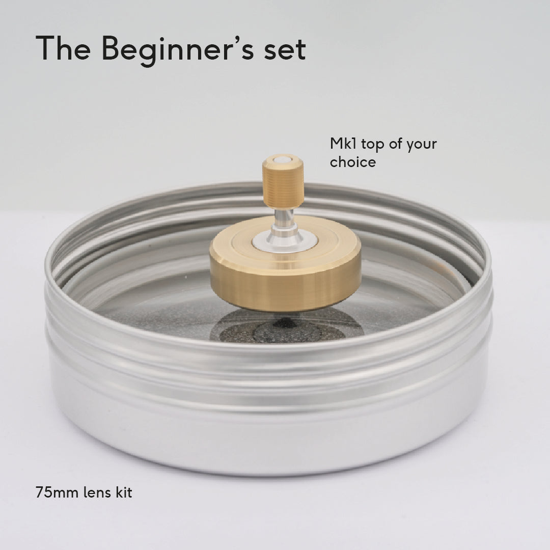 Now, don't get me wrong, our tops will pretty much spin on anything, a hard desktop or marble kitchen surface is fun for a while, but soon enough if you want to get the best out of your new treasure you are going to need something dedicated and built for the job. Our beginners sets come with our newest innovation, a good for anywhere spin station, the lens kit.